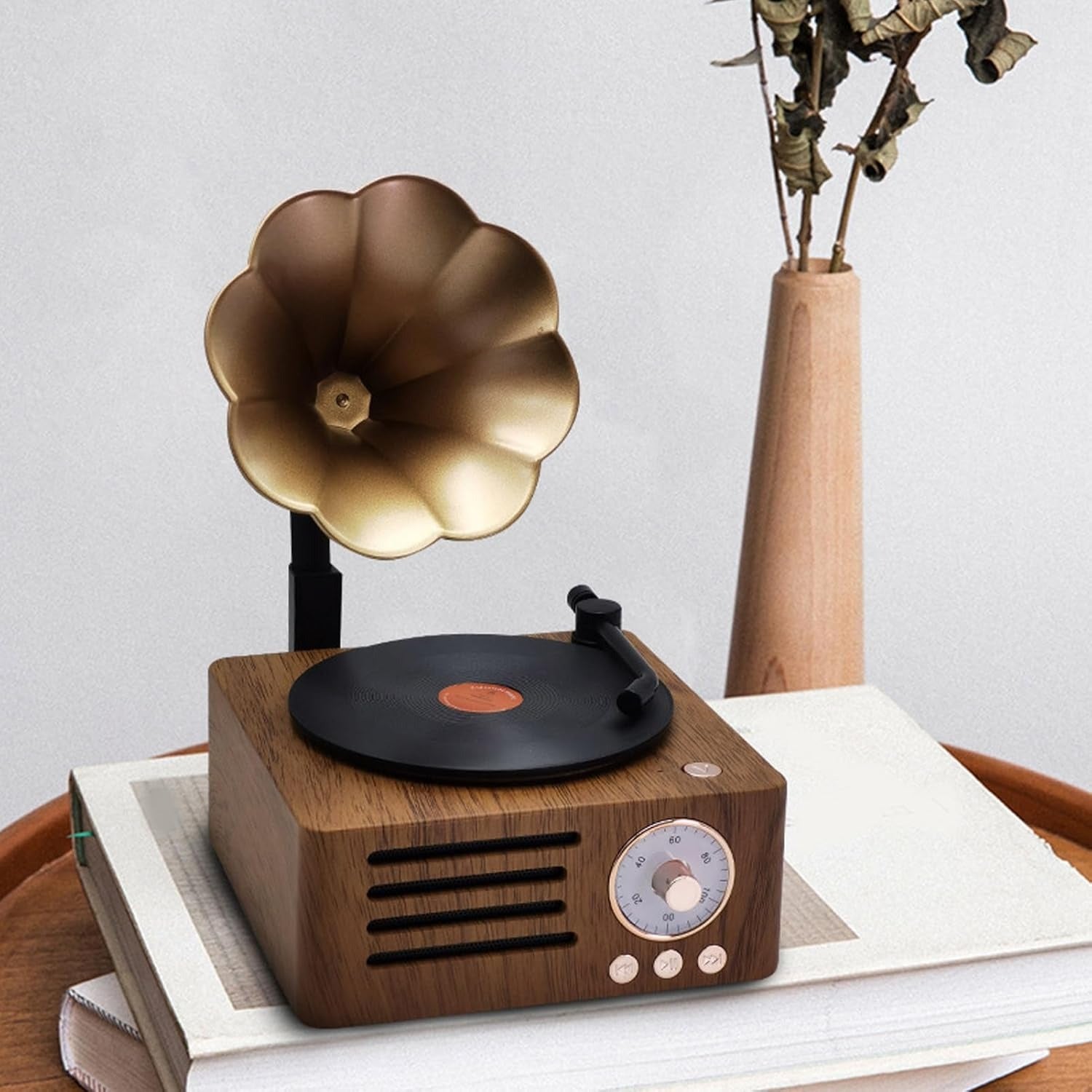 - Retro Bluetooth Speaker, 3 in 1 Aux and Radio Vintage Gramophone Phonograph Turntable Record Player with Copper Horn, Stereo Speakers for Office Desk Decor